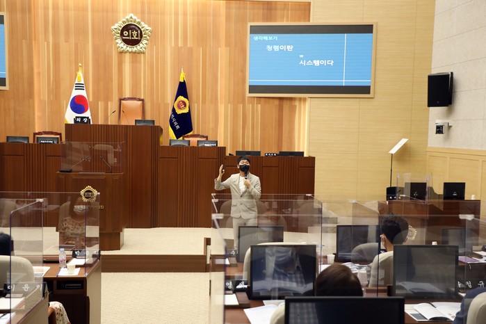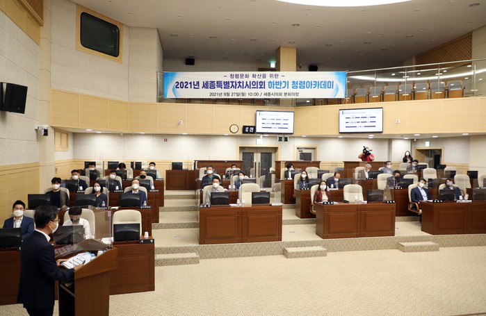 [세종=세계타임즈 이채봉 기자] 세종특별자치시의회(의장 이태환)는 27일 본회의장에서 의원 및 사무처 직원을 대상으로 하반기 청렴 아카데미를 개최하고 이해충돌 방지법과 갑질문화 개선에 관한 교육을 실시했다.