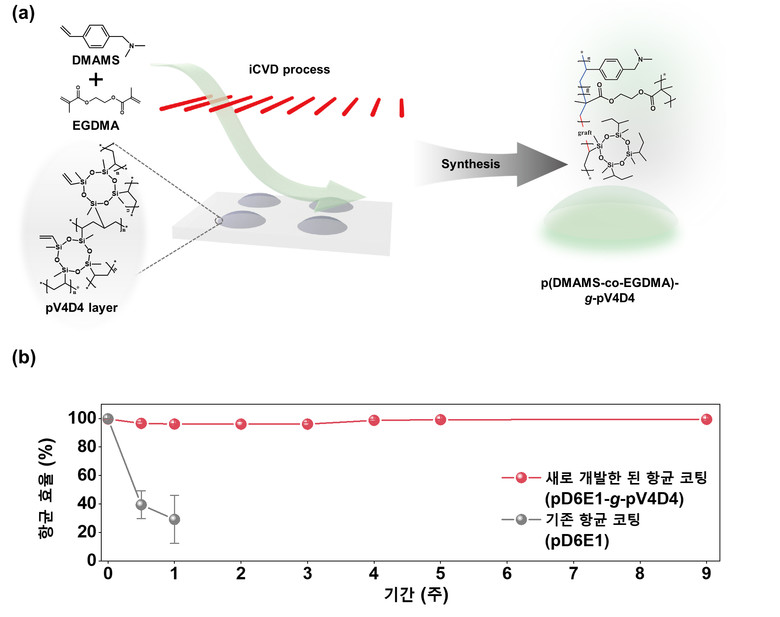 | ▲기상 고분자 증착 공정(iCVD)을 이용한 콘택트렌즈 코팅 과정을 나타낸 그림(a), 새로 개발한 항균 코팅과 기존 코팅의 항균 효율 지속성을 비교한 그래프로, 새로 개발한 코팅이 최대 9주까지 높은 항균력을 유지한다.(b)(사진=용인세브란스) |