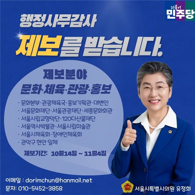- 문화·체육·관광·홍보 분야 시민 의견 집중 반영 [서울 세계타임즈=이장성 기자] 서울특별시의회 문화체육관광위원회 유정희 의원(더불어민주당, 관악4)은 10월 14일부터 11월 4일까지 시민 의견을 직접 접수받는 ‘행정사무감사 시민제보창구’를 운영한다고 밝혔다.