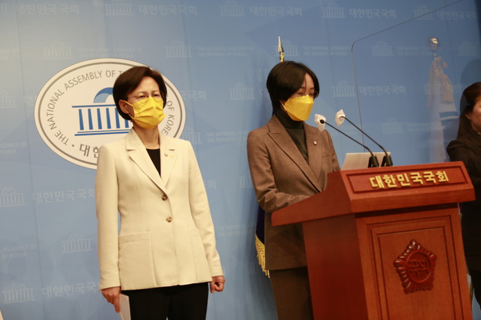 [세계타임즈 이진화 기자]정의당 장혜영 정책위의장, 강은미 의원이 4일 오후 서울 영등포구 여의도 국회 소통관에서 기자회견을 열고 정의당 2022년 예산안 평가 및 요구안을 발표하고 있다.