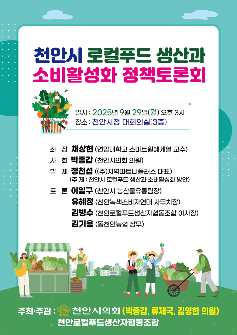 이번 토론회는 천안시의회 박종갑·류제국·김영한 의원과 천안로컬푸드생산자협동조합이 공동으로 주최하며, 로컬푸드 생산자, 시민, 관계 공무원 등 150여 명이 참석할 것으로 예상된다.