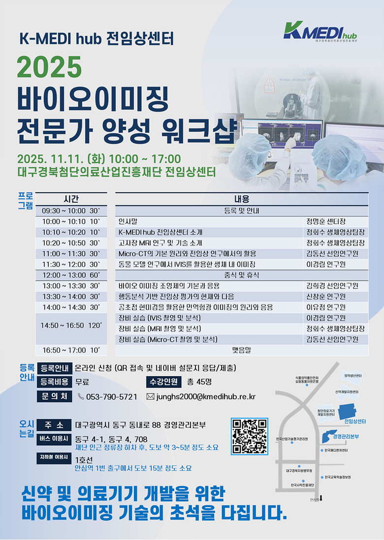 무료로 진행되는 이번 워크숍은 선착순 45명의 참가등록을 받는다. 참여 신청은 포스터 내 QR코드 스캔 또는 이메일(junghs2000@kmedihub.re.kr) 문의를 통해 할 수 있다.