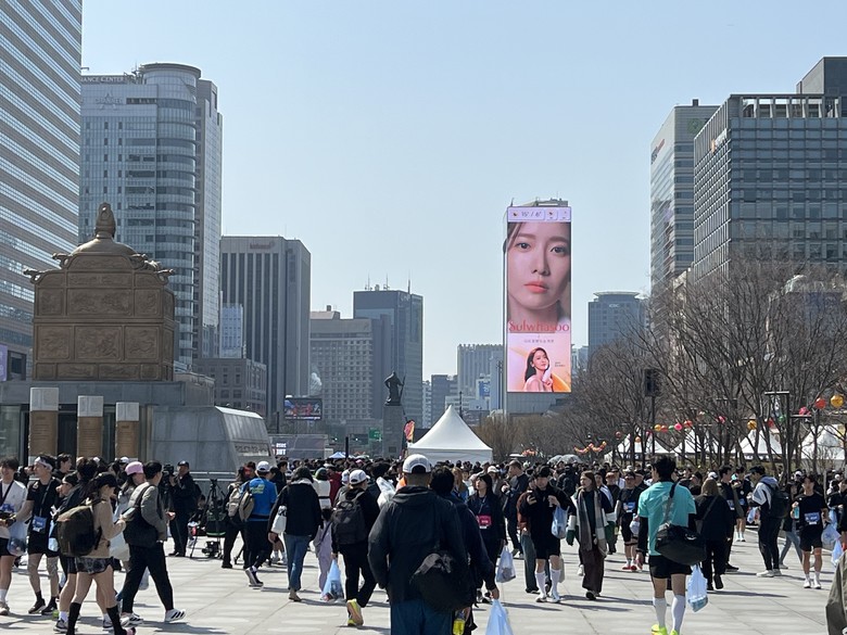 광화문광장은 지난 2월 23일로 예정됐다가 대규모 집회로 연기된 하프마라톤 대회 참가자들로 북적였다.완주에 성공한 참가자들은 상기된 표정으로 메달을 목에 걸며 "봄이다", "해냈다"고 환호했다.광화문 인근에서 만난 미국 관광객 젠 칼슨(41)씨는 "이제는 와도 되겠다는 생각에 북촌을 방문하게 됐다"며 "날도 따뜻하고 광장이 북적이는 모습이 인상적"이라고 했다.