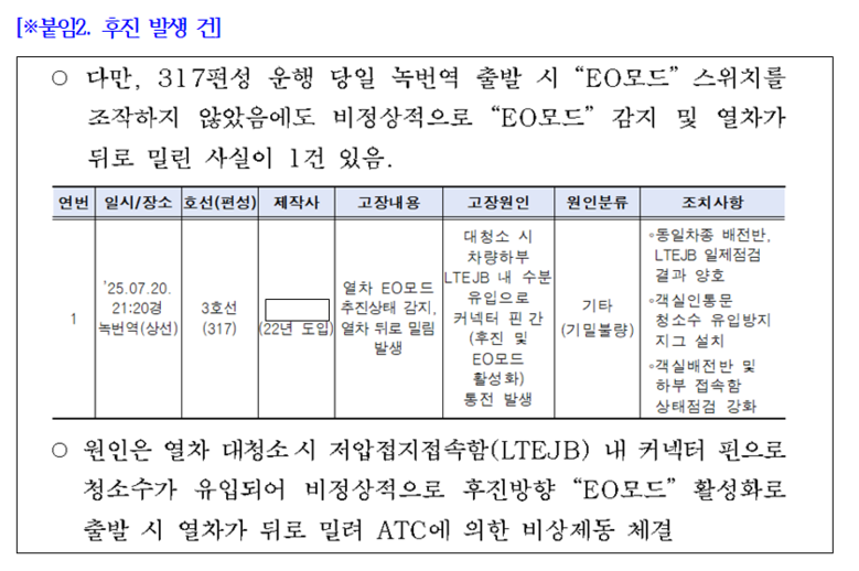 특히 지난 7월 20일 3호선 녹번역에서는 승무원이 EO모드 스위치를 조작하지 않았음에도 EO모드가 비정상적으로 감지되면서 열차가 뒤로 밀리는 이례적 후진 사례가 발생했다. 이 과정에서 비상제동이 체결되었으며, 공사는 차량 구조적 결함이 아니라 대청소 과정에서 청소수가 차량 하부 접속함으로 유입돼 발생한 것이라고 해명했다. [※붙임2]