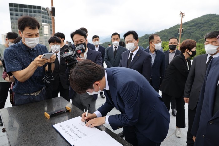 이준석 국민의힘 대표가 3일 오전 경남 창원시 국립3·15민주묘지를 찾아 참배한 후 방명록에 서명하고 있다.