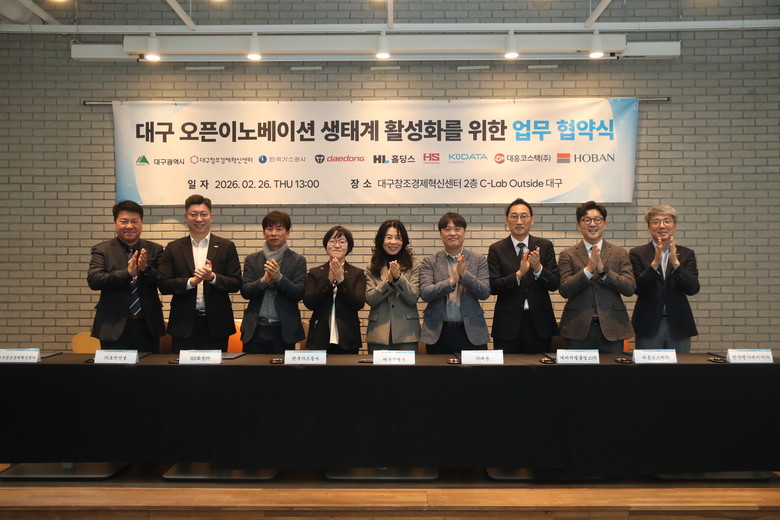 ▸ 실증자금 4천만 원 지원·대기업 인프라 개방… ‘상생 생태계’ 구축 [세계타임즈=대구 한윤석 기자] 대구광역시와 대구창조경제혁신센터는 2월 26일(목) 대구센터 2층에서 ‘대구 스타트업 오픈이노베이션 지원사업’ 공동 운영을 위한 업무협약(MoU)을 체결했다.