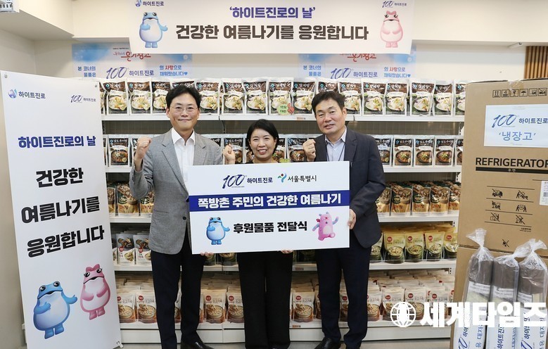 하이트진로 정세영 상무(왼쪽), 서울역쪽방상담소 유호연 소장(가운데) 및 고광훈 서울시 복지기획관(오른쪽) 등 관계자가 참석한 가운데 서울역 쪽방촌 내 ‘온기창고’에서 쪽방촌 거주민 ‘건강한 여름나기’를 위한 후원품 전달식을 가졌다.