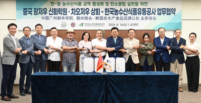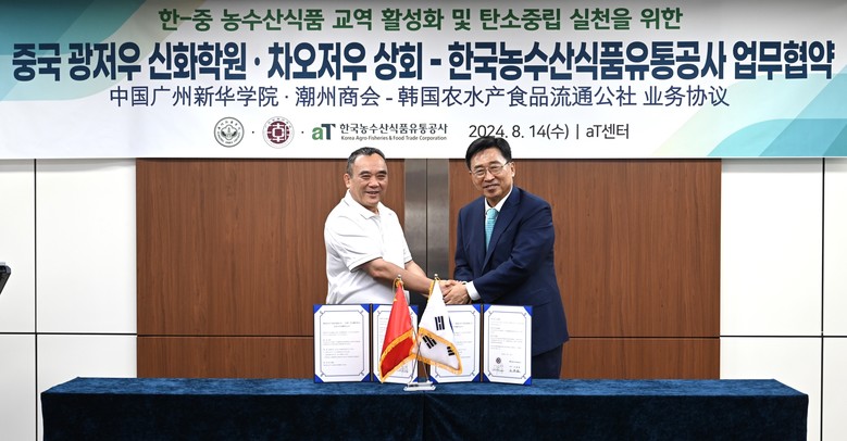 [세계타임즈 = 이현진 기자] 한국농수산식품유통공사(사장 김춘진)는 14일 서울 양재동 aT센터에서 중국 광동성 소재 광저우 신화학원(이사장 류룽하이), 차오저우 상공회의소(회장 류룽하이)와 한중 농수산식품 교역 활성화와 글로벌 탄소중립을 위한 업무협약을 체결했다.