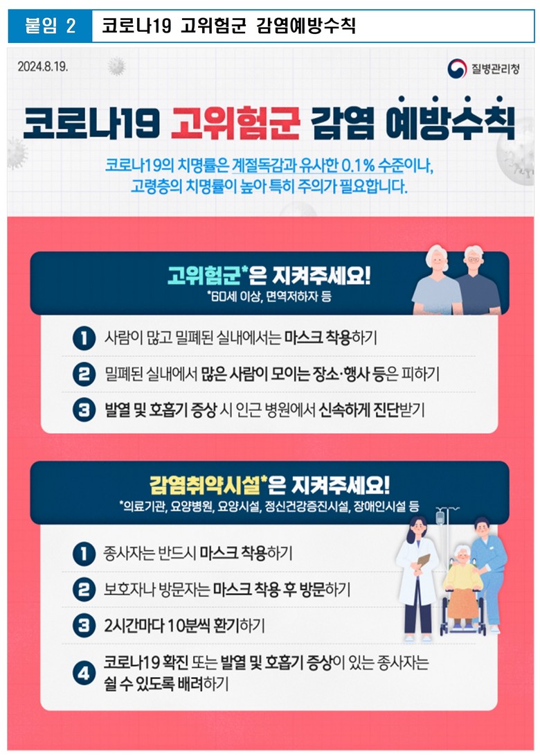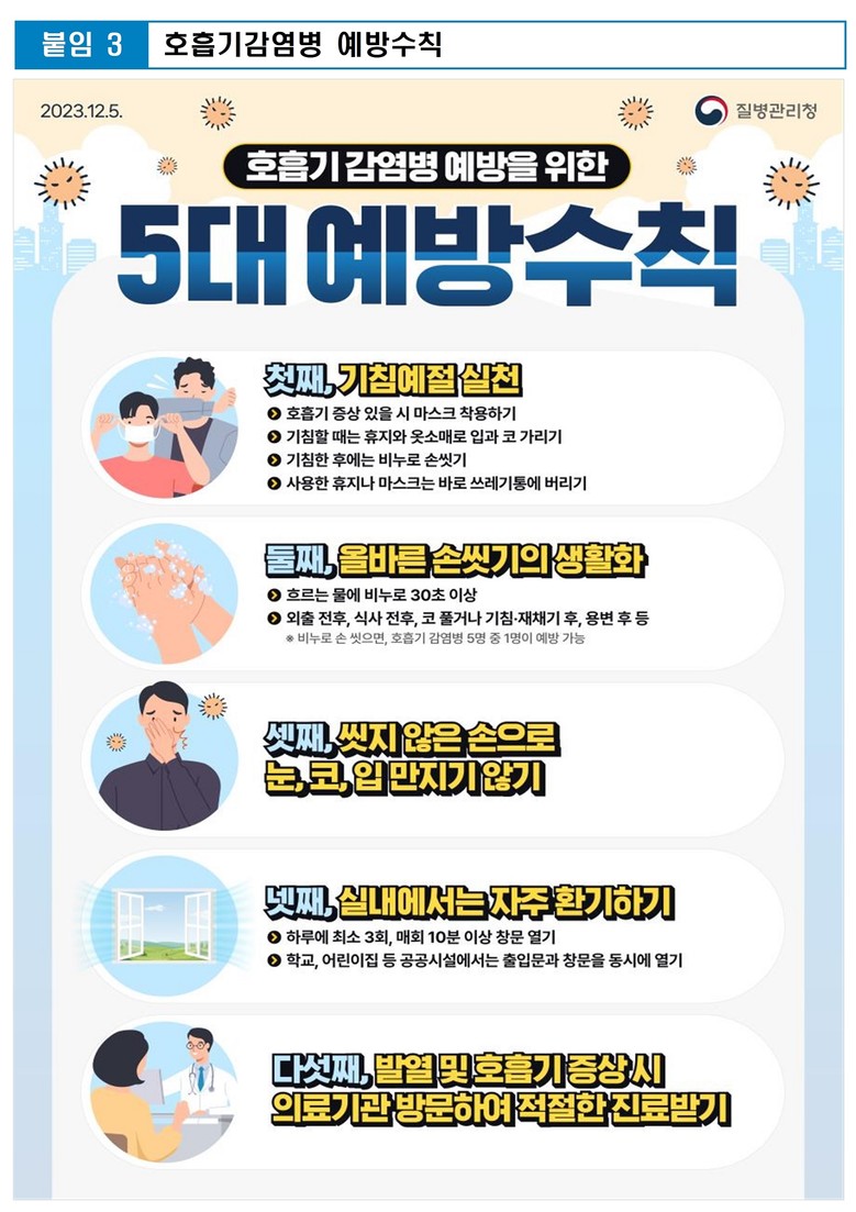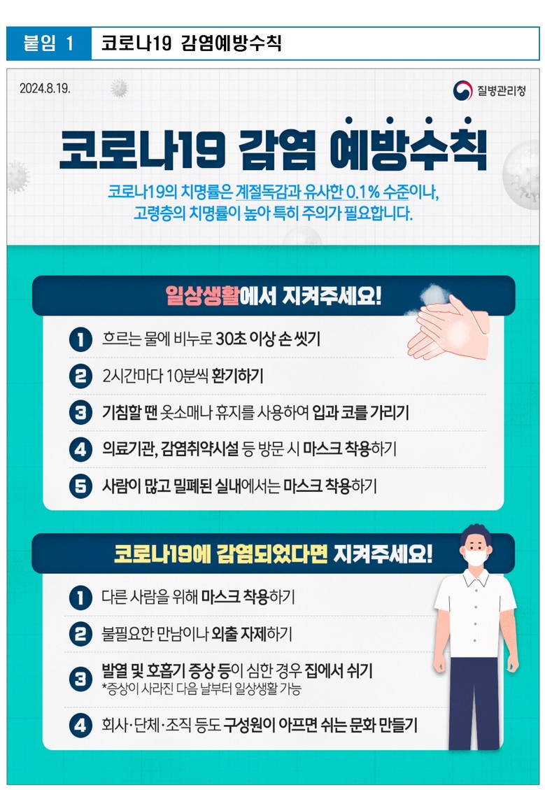 [부산 세계타임즈=이용우 기자] 코로나19로 입원한 환자 수가 5주 연속 늘어나고 있는 가운데, 부산광역시의회 이종환 의원(국민의힘, 강서구)이 부산시민들께 코로나19 감염예방수칙(붙임, 질병관리청 배포)을 준수해주실 것을 요청하고 나섰다.