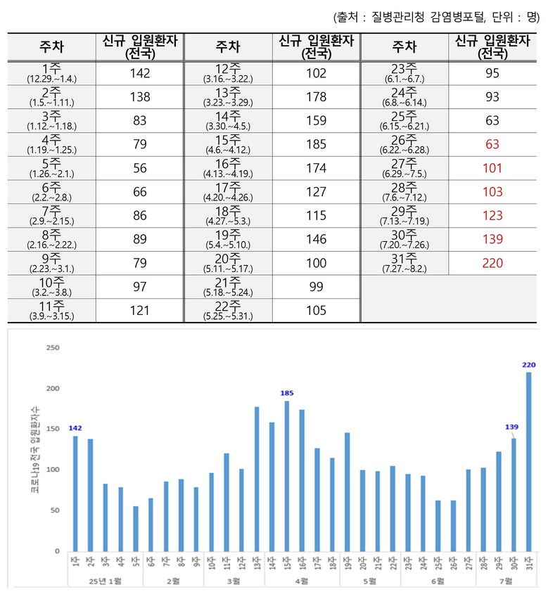 이종환 의원은 “전국의 코로나19 신규 입원환자는 지난 26주차(6.22.~6.28.) 63명에서 101명, 103명, 123명, 139명을 거쳐 31주차(7.27.~8.2.)에는 220명으로 늘어나며 5주 연속 증가세를 보이고 있다.”라며, “5주 만에 입원환자 수가 3.5배 증가한 것인데, 표본감시인 점을 감안하면, 실제로는 더 많은 입원환자가 존재하며, 숨은 확진자는 더욱 많을 것이다.”라고 설명하였다. 주별 신규 입원환자 수 추이는 아래(표, 그래프)와 같다.