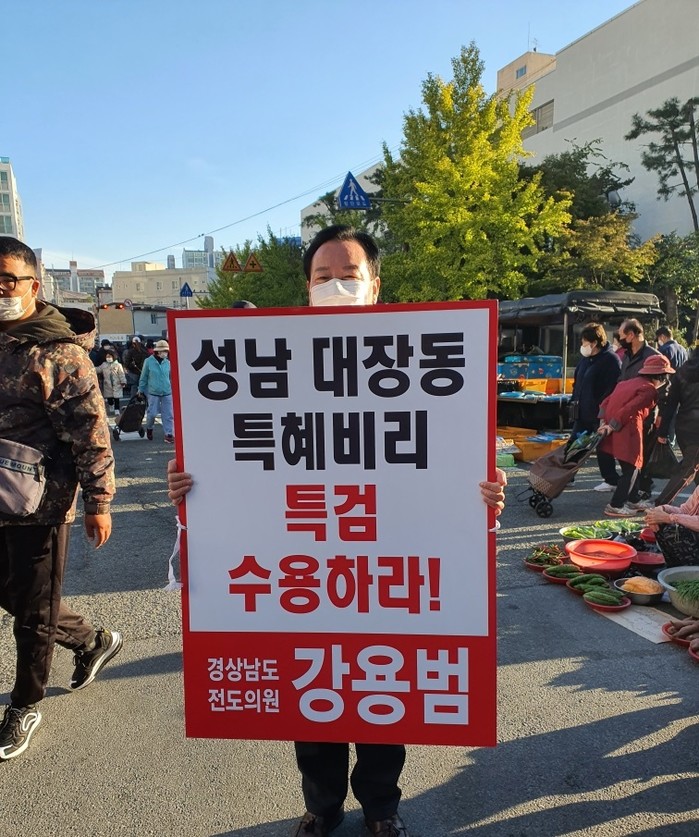 [세계타임즈 이진화 기자]국민의힘 강용범 전 경남도의원이 지난 24일 오전 마산합포구 번개시장에서 '성남 대장동 특혜비리, 특검 수용하라! 경상남도 전 도의원 강용범'이라고 적힌 피켓을 들고 1인시위를 하고 있다.