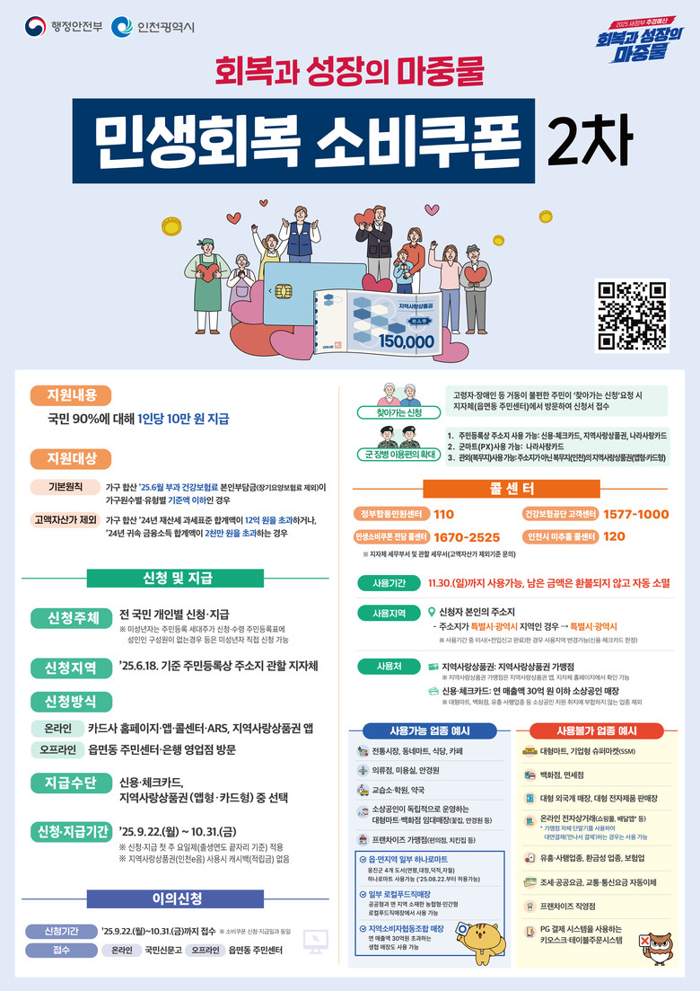 신청 첫 주(9월 22~26일) 민원 혼잡을 줄이기 위해 출생 연도 끝자리별 요일제가 적용되며, 인천시 지역 내 연 매출 30억 원 이하 소상공인 매장 및 지역사랑상품권 가맹점에서 11월 30일까지 사용할 수 있다.