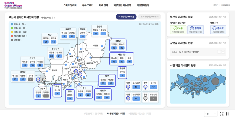 [해양미세먼지 모니터링 서비스]는 환경위성영상과 지상 대기측정소 데이터를 융합해 행정구역과 갈맷길 단위로 실시간 미세먼지 정보를 사용자 위치 기반으로 시각화해 제공함으로써 시민들이 미세먼지 정보를 쉽게 확인할 수 있게 한다. 또한, 이 사업을 통해 지상 라이다(LiDAR, Light Detection and Ranging) 기반 해양미세먼지 모니터링 기술 개발, 해상교통 데이터를 활용한 탄소배출 통계지도 구축 기술 개발을 지원하고, 관련 성과를 공개해 항만·연안 지역의 대기질 관리와 정책 수립에 활용할 수 있는 과학적 의사결정 기반을 제공한다.