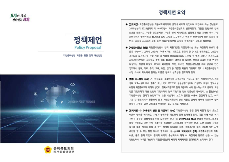‘정책제언’은 의원들의 의정활동을 신속하고 전문적으로 지원하기 위해 의회에서 발간하는 연구보고서로 국내외 입법 현황, 충북을 포함한 타 시·도 조례 검토와 이에 따른 정책 개선 및 입법 방향 등을 담고 있다.