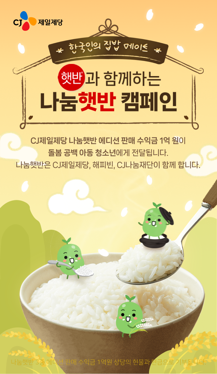 이번 캠페인은 3월 15일까지 해피빈 굿액션에서 진행되며, CJ제일제당은 네이버에서만 구매할 수 있는 ‘해피빈 나눔햇반 백미밥’, ‘해피빈 나눔햇반 발아현미밥’, ‘해피빈 나눔햇반솥반 버라이어티팩’ 3종을 선보인다. 해피빈 굿액션은 기업의 나눔 활동 등 다양한 공익 캠페인을 소개하고 기부할 수 있는 플랫폼이다.