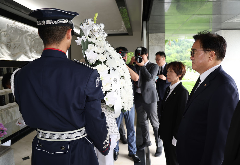 [세계타임즈 = 심귀영 기자] 광복절인 15일 오전 우원식 국회의장이 서울 동작구 국립서울현충원 독립유공자묘역 무후선열제단에서 헌화하고 있다. 2024.8.15
