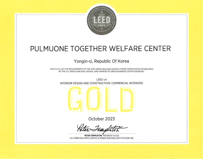 풀무원투게더가 받은 LEED 골드는 LEED 신축건물 인증 가운데 가장 최신 버전인 V4에서 플래티넘에 이어 두 번째로 높은 등급이다. LEED는 1998년에 미국 그린빌딩위원회에 의해 처음 도입되어, 현재는 전 세계적으로 가장 널리 사용되고 있는 친환경 건축물 인증제도다. 풀무원에선 2020년 풀무원기술원이 국내 식품연구소 최초로 LEED V4 골드등급을 받은 바 있다.