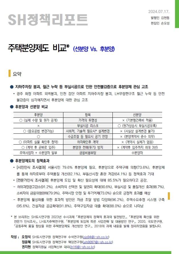 정책리포트는 ▲ 주택분양제도의 정의 및 장단점 ▲ 후분양제도의 연혁(변화과정) ▲ 후분양제에 대한 정책효과 조사분석(서울시민과 전문가 인식조사) ▲ 후분양제에 대한 주요쟁점 이슈 ▲ 제도개선 등의 내용으로 구성된다.