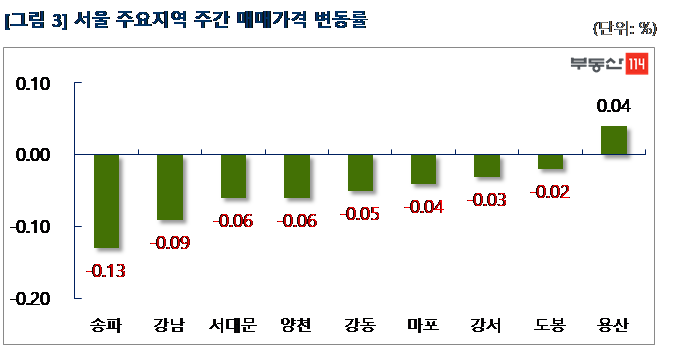 부동산114(www.r114.com)에 따르면 금주 서울 아파트값은 0.04% 떨어져 13주 연속 하락했다. 서울 재건축 시장도 0.09% 하락해 15주 연속 내림세다. 신도시와 경기ㆍ인천은 각각 0.02% 떨어져 5주 연속 약세를 나타냈다. 전세가격도 서울과 신도시, 경기ㆍ인천지역 모두에서 하락했다. 서울이 0.07% 떨어졌고 신도시와 경기ㆍ인천도 각각 -0.07%, -0.09% 변동률을 나타냈다.