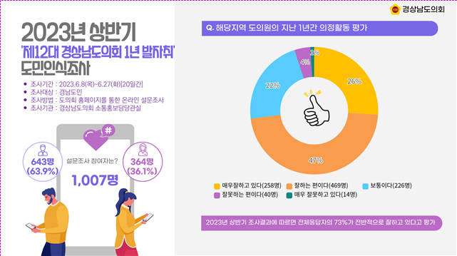 [경남 세계타임즈=최성룡 기자] 경상남도의회는 2023년 6월 8일부터 27일까지 20일간 도의회 홈페이지를 통해「제12대 경상남도의회 1년 발자취」라는 주제로 도민인식조사를 실시했다.