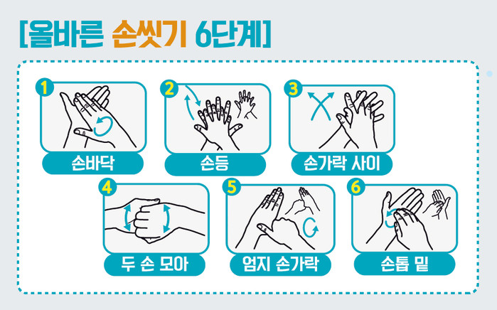 엄지손가락을 다른 편 손바닥으로 돌려주면서 문질러 준다. 마지막으로 손가락을 반대편 손바닥에 놓고 문지르며 손톱 밑을 깨끗이 해준다. 이상 6단계로 1일 수차례 손위생을 철저히 시행해야 한다.
