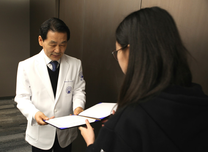 | ▲ 자생의료재단 박병모 이사장이 장학 증서를 전달하고 있다. |