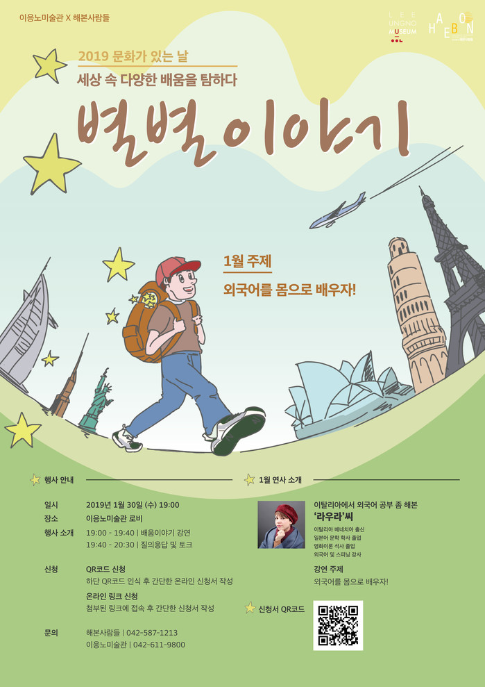 [대전=세계타임즈 이장성 기자] 이응노미술관(관장 이지호)은 2019년 첫 문화 프로그램으로 대전에 거주하는 외국인 또는 외국 유학 경험이 있는 다양한 직업군의 강사를 섭외하여 대전지역의 학생 및 가족, 일반인들과 함께 세계 각국에서의 교육경험과 자신의 이야기를 공유하는 <별별이야기>를 진행한다.