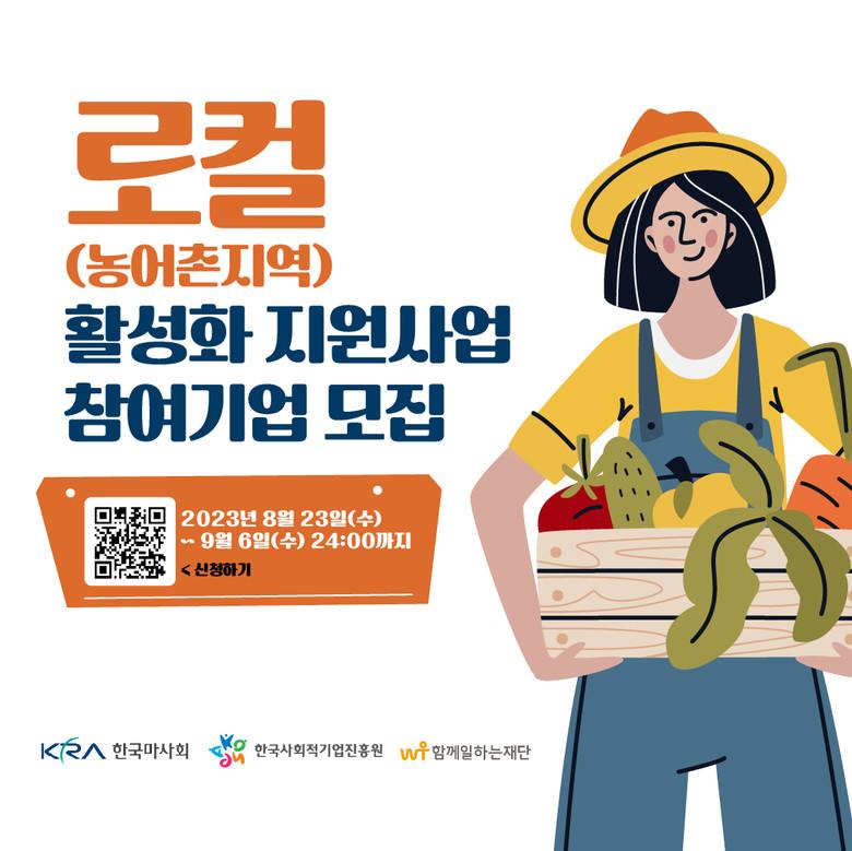 [세계타임즈 = 송민수 기자] 한국마사회(회장 정기환)는 함께일하는재단(이사장 이세중), 한국사회적기업진흥원(원장 정현곤)과 함께 “2023년도 로컬(농어촌지역) 활성화 지원사업”(이하 지원사업)에 참여할 사회적경제기업을 8월 23일부터 9월 6일까지 모집한다고 밝혔다.