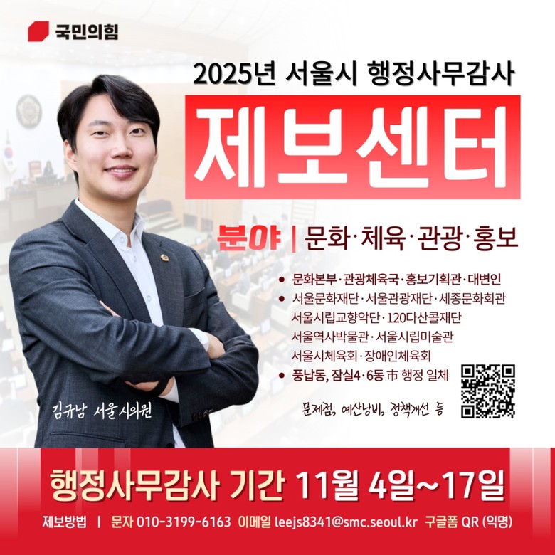 이번 제보센터는 서울시와 산하기관의 문제점, 예산 낭비, 비리, 정책 개선 필요 사항 등을 시민들로부터 직접 접수받아 감사 현장에서 다루기 위한 취지로 마련됐다. 특히 문화·체육·관광·홍보 분야가 집중 감사 대상이며, 시민 생활과 밀접한 사안부터 대규모 정책에 이르기까지 폭넓게 제보할 수 있다.