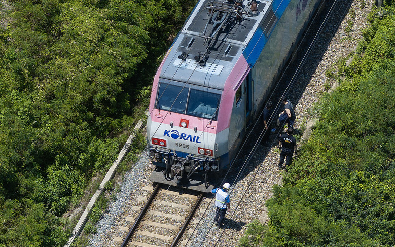 무궁화호 열차가 선로 인근에서 작업 중이던 근로자 7명을 치는 사고가 발생한 19일 경북 청도군 화양읍 삼신리 청도소싸움 경기장 인근 경부선 철로에서 경찰과 소방, 코레일 등 관계자들이 사고가 난 무궁화호 열차를 조사 하고 있다. 2025.8.19