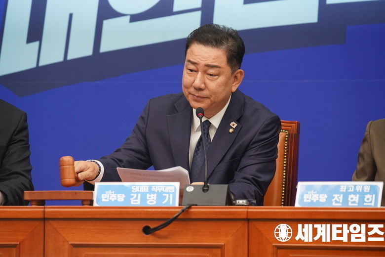 더불어민주당 '김병기' 당 대표 직무대행 겸 원내대표가 28일 서울 여의도 국회에서 열린 최고위원회의에서 의사봉을 두드리고 있다.세계타임즈 / 신상철 기자 news@thesegye.com