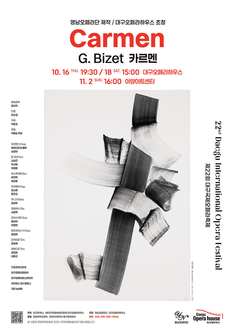 영남오페라단이 제작하는 조르쥬 비제(G.Bizet)의 대표작 <카르멘>은 스페인 세비야를 배경으로 하는 프랑스 오페라로, 자유로운 영혼의 집시여인 카르멘을 중심으로 비극적인 삼각관계를 그린다. ‘서곡(Overture)’, ‘하바네라(Habanera)’, ‘투우사의 노래(Chanson du Toreador)’ 등 유명 아리아로 잘 알려져 있으며, 세계에서 가장 인기 있는 오페라 중 하나로 손꼽힌다.
