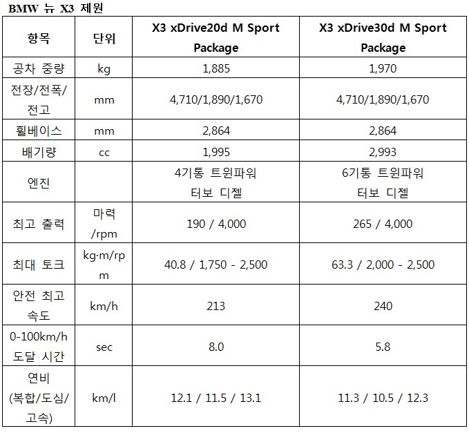 뉴 X3 xDrive20d의 2리터 4기통 디젤 엔진은 최고출력 190마력, 1,750~2,500rpm 구간에서 최대토크 40.8kg.m을 발휘한다. 100km/h까지의 가속 시간은 8.0초, 최고 속도는 213km/h이다. 복합 연비는 12.1km/l이며, 이산화탄소 배출량은 162g/km다.
