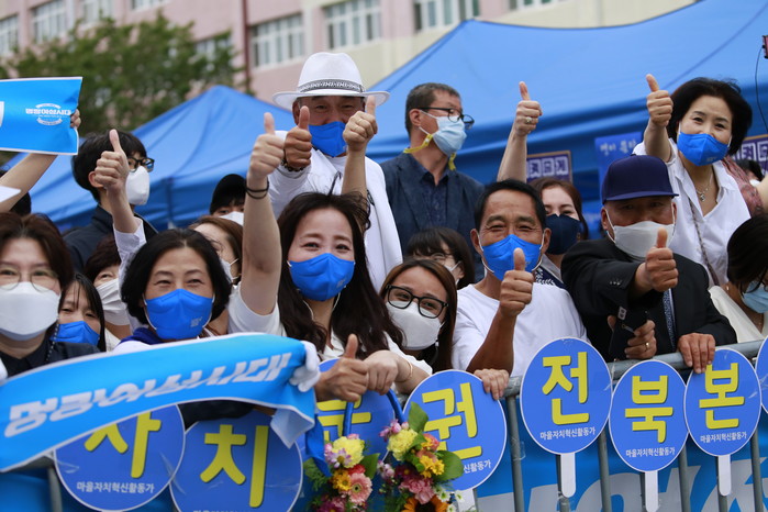 [세계타임즈 이진화 기자]더불어민주당 대선후보 선출을 위한 전북 지역경선 합동연설회가 지난 26일 오후 전북 완주군 우석대학교 체육관에서 시작된 가운데 이재명 후보의 열렬한 지지자인 보수 시민단체 애국국민운동대연합 오천도 대표가 열띤 지지 응원전을 펼치고 있다.