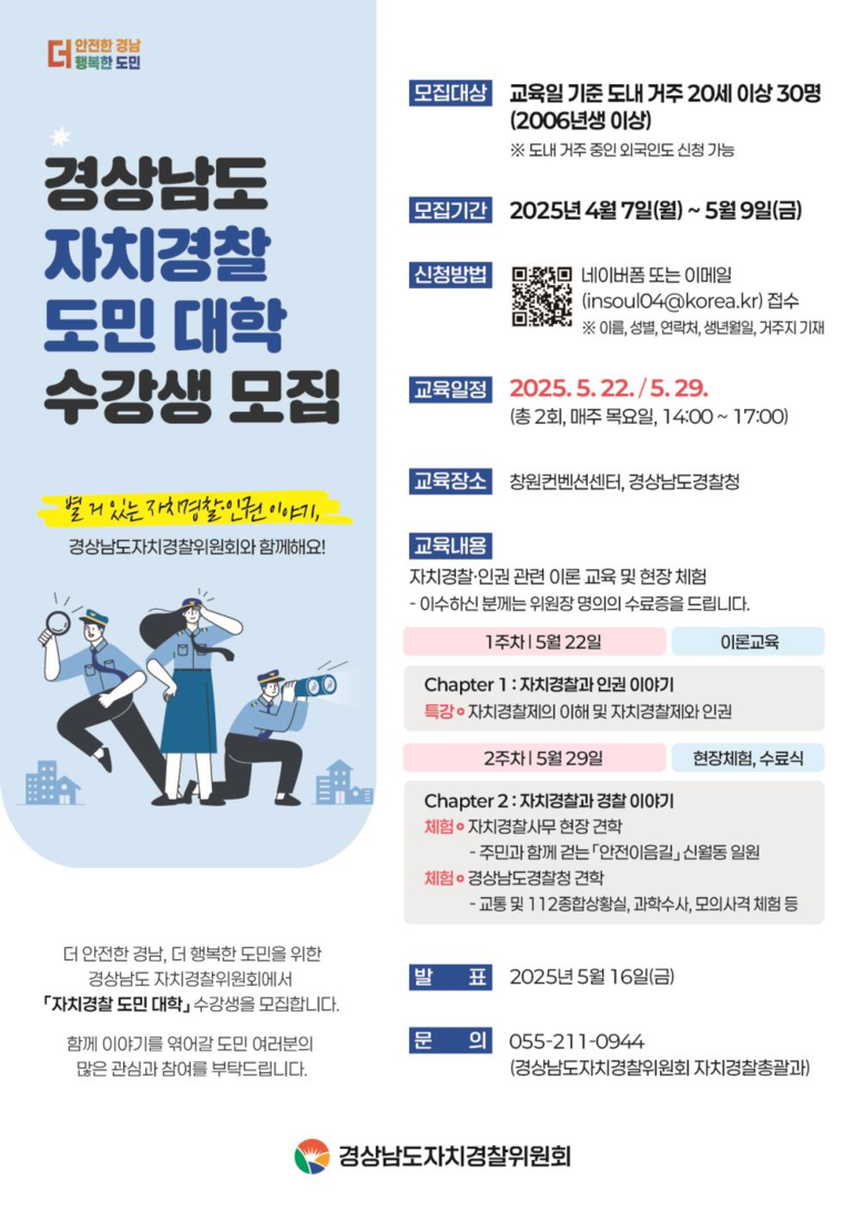 1주차에는 자치경찰제와 도민 인권에 관한 특강이 진행되며, 2주차에는 범죄 예방 환경 개선을 위해 추진 중인 ‘신월동 주민과 함께 걷는 안심이음길’ 현장 체험, 경상남도경찰청 112 종합상황실.과학수사실 견학 등이 예정돼있다.