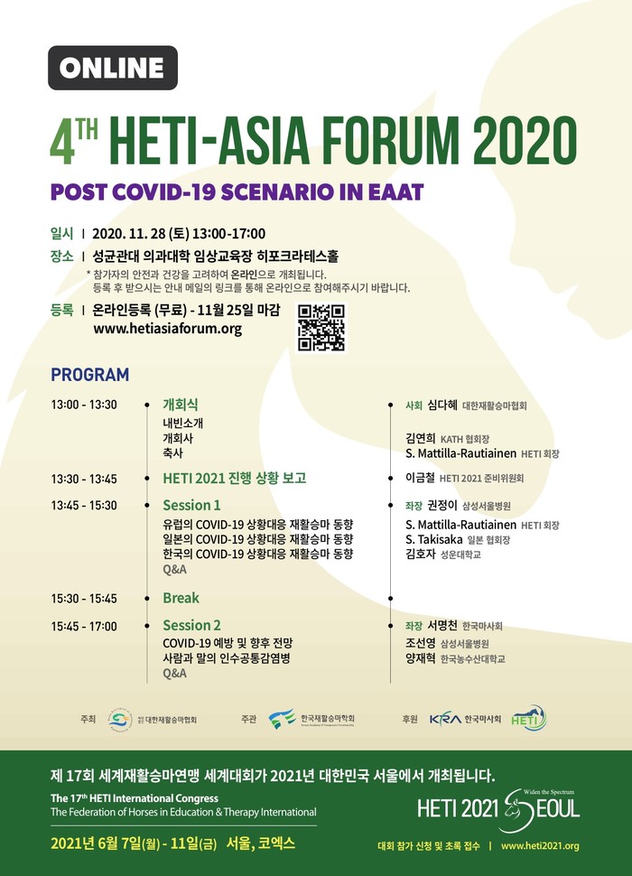 한편 HETI 2021 조직위원회에서는 학술발표자료의 초록(抄錄)을 받고 있다. 초록 접수 마감일은 2월 20일이다. 재활, 승마, 교육 등 각 분야의 초록을 받는다. 이번 대회에는 로봇공학과 가상현실 분야가 특별 프로그램으로 추가되었다. 재활승마 관련 최신 연구와 전문가들 간 의견 공유가 이루어질 것으로 기대된다. 초록이 채택된 사람들에게는 별도로 이메일이 발송될 예정이다.