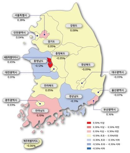 주요 시도별 매매가격은 세종(0.65%), 부산(0.16%), 전남(0.10%) 등은 상승했다. 충남(-0.12%), 경남(-0.11%), 경북(-0.09%), 울산(-0.07%) 등은 하락했다.
