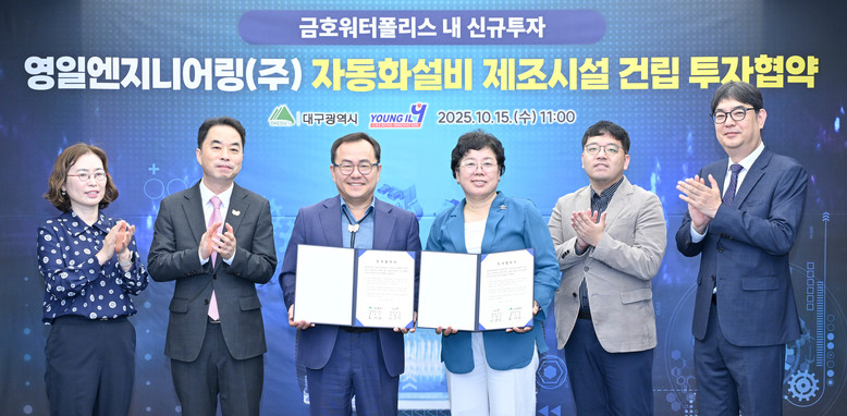 ▸ 전기차 부품 자동화설비 제조시설 건립… 2027년 1분기 가동 목표 [세계타임즈=대구 한윤석 기자] 대구광역시는 10월 15일(수) 대구시청 산격청사에서 영일엔지니어링㈜(대표 이창은)과 금호워터폴리스 내 ‘전기차 부품 자동화설비 제조시설’ 건립을 위한 투자협약을 체결했다.