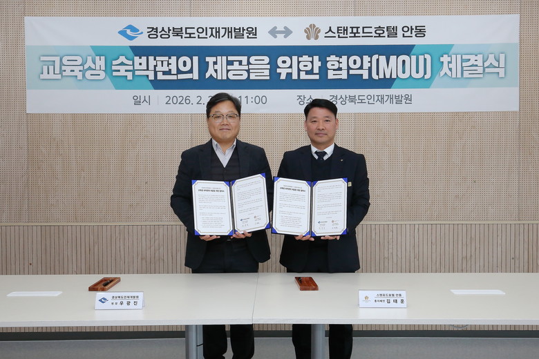 이에 따라 교육생들은 스탠포드호텔 안동의 객실(2인 1실)을 시중 대비 대폭 할인된 가격으로 이용할 수 있게 된다. 지난해 8월 인재개발원이 도청 신도시로 이전함에 따라 교육생 수요가 몰리며 숙소 예약의 번거로움과 비용 문제가 계속 제기돼 왔다는 점에서, 이번 협약은 더욱 큰 의미를 갖는다.