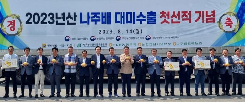 [세계타임즈 = 이현진 기자] 한국농수산식품유통공사 김춘진 사장은 14일 나주배원예농협 산지유통센터(조합장 이동희)를 찾아 2023년산 나주 햇배 미국 첫 수출 선적식에 참석했다.