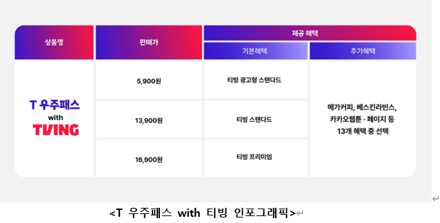 SKT가 이번에 선보이는 T 우주 티빙 구독 서비스는 광고형 스탠다드(4,500원), 스탠다드(1만2,500원), 프리미엄(1만6,000원) 등 세 가지 단품으로 구성된다. 이들 상품은 기존 티빙 상품보다 각각 1,000원씩 저렴한 가격에 이용할 수 있다.