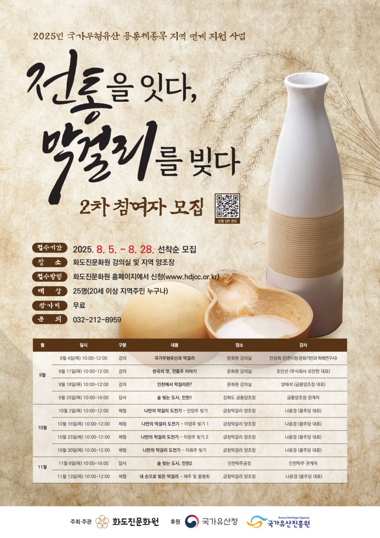 조장환 화도진문화원장은 “수강생들이 이번 기회로 국가무형유산의 소중함을 깨닫고, 각자의 자리에서 우리 전통문화의 가치를 널리 알리는 현대적 전승자가 되어주시길 소망한다”며 “단순한 배움을 넘어, 우리 막걸리 문화의 보존과 발전에 자부심을 갖고 동참해주셨으면 한다”고 말했다.