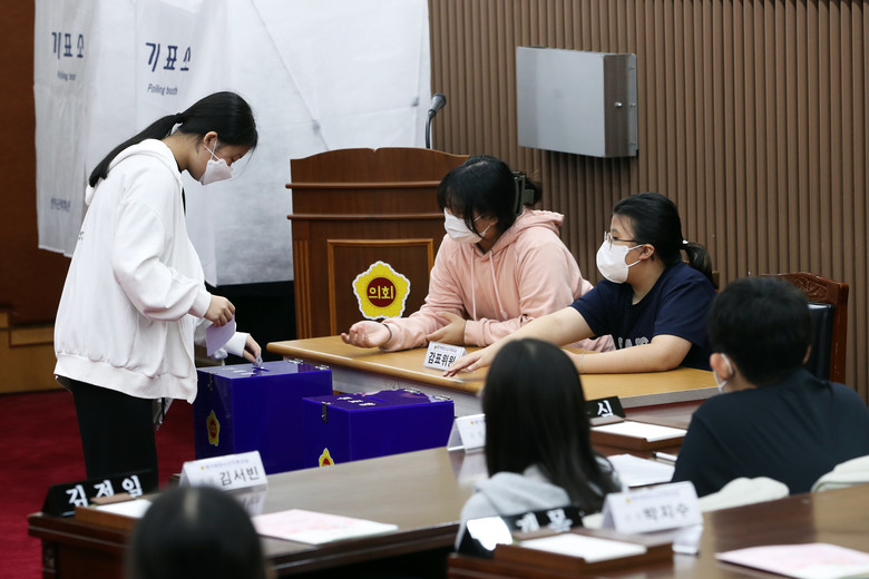 먼저 3명의 의장 출마자가 정견 발표를 한 후 무기명 투표를 통해 의장을 직접 선출하였으며, ‘중·고등학교 교복 구입 지원금을 증액합시다’, ‘학교 운동장 바닥을 모래가 아닌 친환경 고무로 바꿔주세요’ 등의 조례안과 건의안을 전자투표를 통해 의결했다.