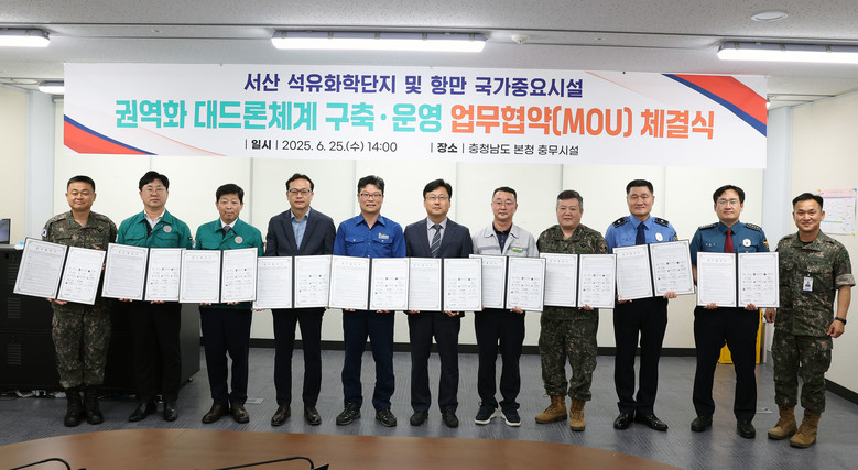 도는 25일 도 전시종합상황실에서 육군 제32보병사단, 국가정보원 지부, 도 경찰청 등 11개 기관과 ‘서산 국가중요시설 관련 광역화 대드론체계 구축·운영’을 위한 업무협약을 체결했다고 밝혔다.