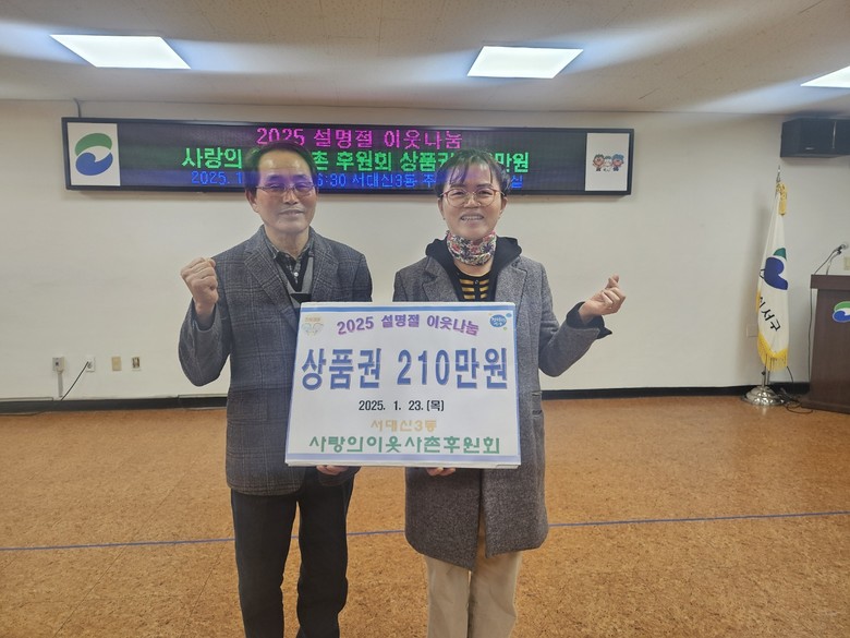 [서구 세계타임즈=이용우 기자] 부산 서구 서대신3동 사랑의 이웃사촌 후원회(회장 박쌍남)는 지난 23일 설 명절을 맞아, 취약계층 가정과 소외된 이웃을 위한 탑 마트 상품권 (210만 원)을 전달했다.