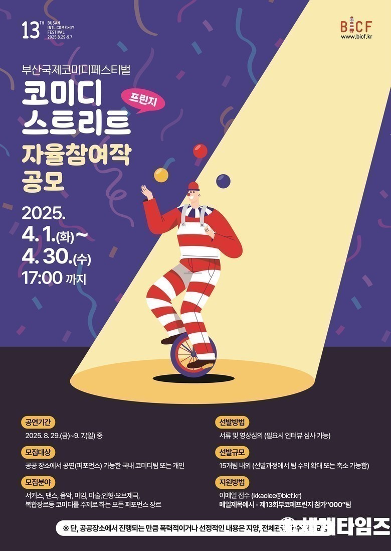 제13회 ‘부산국제코미디페스티벌(BICF)(이하 부코페)’ 개최를 앞둔 부산국제코미디페스티벌조직위원회(이하 조직위)는 “지난 1일부터 코미디 스트리트 자율 참가 공연팀(이하 프린지) 모집을 시작했다”고 밝혔다.