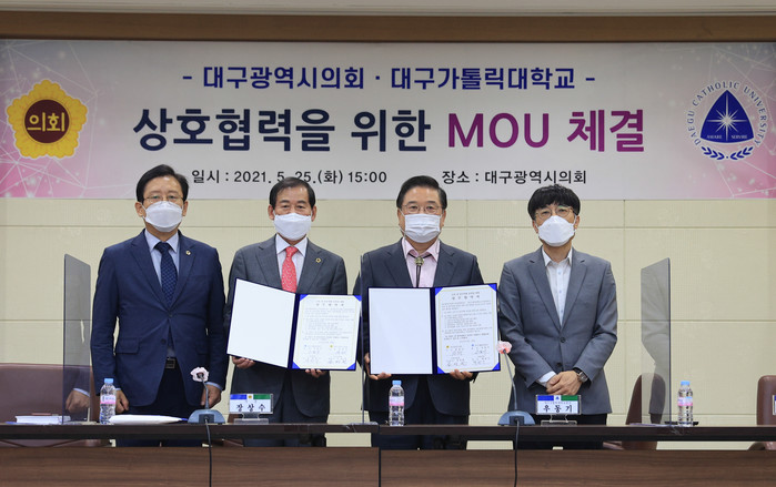 이날 협약식에는 장상수 대구시의회 의장과 우동기 대구가톨릭대학교 총장이 참석하여 서로 협약서를 교환하면서 향후 긴밀한 협력을 약속하였다.