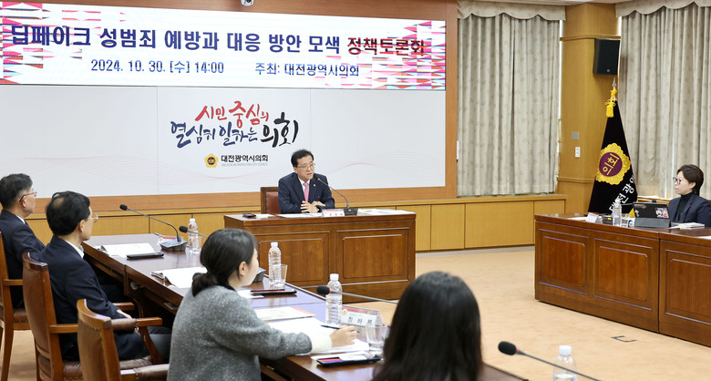 [대전 세계타임즈=이채봉 기자] 대전시의회는 30일 시의회 소통실에서 조원휘 의장(국민의힘, 유성구 3)주재로 ‘딥페이크 성범죄 예방과 대응 방안 모색 정책토론회'를 개최했다.