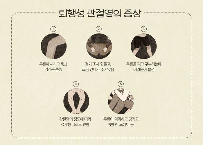 관절염은 체중이 많을수록 더 빨리 나타난다. 무릎이 받는 하중이 그만큼 커지기 때문이다. 그래서 관절염 환자들은 무릎에 부하를 줄이기 위해 노력한다. 퇴행성 관절염 초기에는 관절 표면의 충격 흡수 기능이 떨어지기 시작하고 조금 더 진행되면 연골이 점차 없어지면서 무릎에 심한 통증을 느끼게 된다. 더 나아가면 무릎이 아프고 쑤시면서 보행조차 힘들어지게 된다.