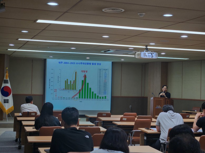 교육 첫 날은 제주도의 성공적인 방제 전략 수립에 크게 기여한 김동순 제주대 교수가 강사로 나서 소나무재선충병 피해가 극심했던 제주도의 성공적인 방제 전략 및 현장 경험 등의 정보를 공유했다.